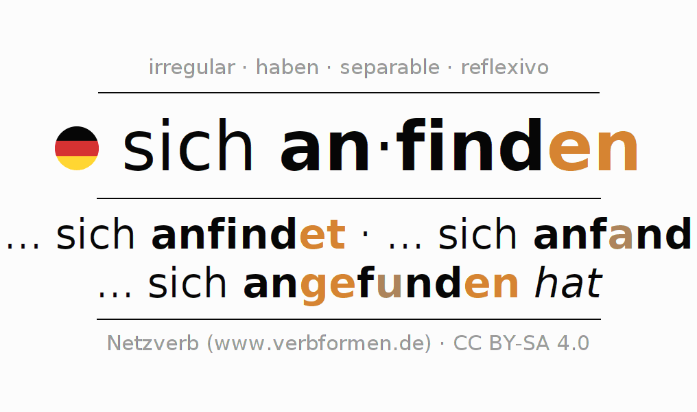 - Pasado perfecto: ... ich mir/mich angefunden habe, ... du dir/dich angefunden habest, ... er sich angefunden habe, ... wir uns angefunden haben, ... ihr euch angefunden habet, ... sie sich angefunden haben