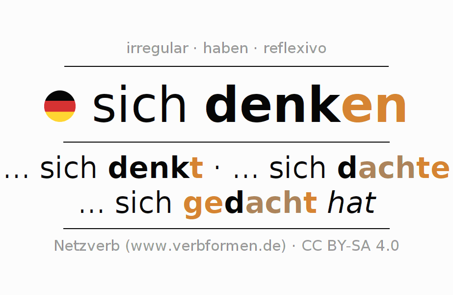 Tablas de verbos para la conjugación de sich denken en línea, representadas de forma simple, con todas las construcciones verbales en singular y plural, en todas las personas gramaticales (1ª persona, 2ª persona, 3ª persona). El practicar la conjugación del verbo sich denken es útil para tareas, exámenes, la escuela, la universidad, las clases de alemán y para los estudiantes adultos. Especialmente para los estudiantes del alemán es muy importante el conjugar los verbos y el formar las raíces verbales de forma correcta. Aquí encuentras más información acerca del tema Wiktionary denken und unter denken im Duden.
