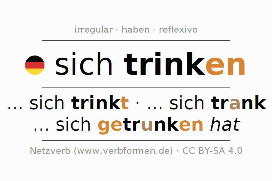 Tablas de verbos para la conjugación de sich trinken en línea, representadas de forma simple, con todas las construcciones verbales en singular y plural, en todas las personas gramaticales (1ª persona, 2ª persona, 3ª persona). El practicar la conjugación del verbo sich trinken es útil para tareas, exámenes, la escuela, la universidad, las clases de alemán y para los estudiantes adultos. Especialmente para los estudiantes del alemán es muy importante el conjugar los verbos y el formar las raíces verbales de forma correcta. Aquí encuentras más información acerca del tema Wiktionary trinken und unter trinken im Duden.