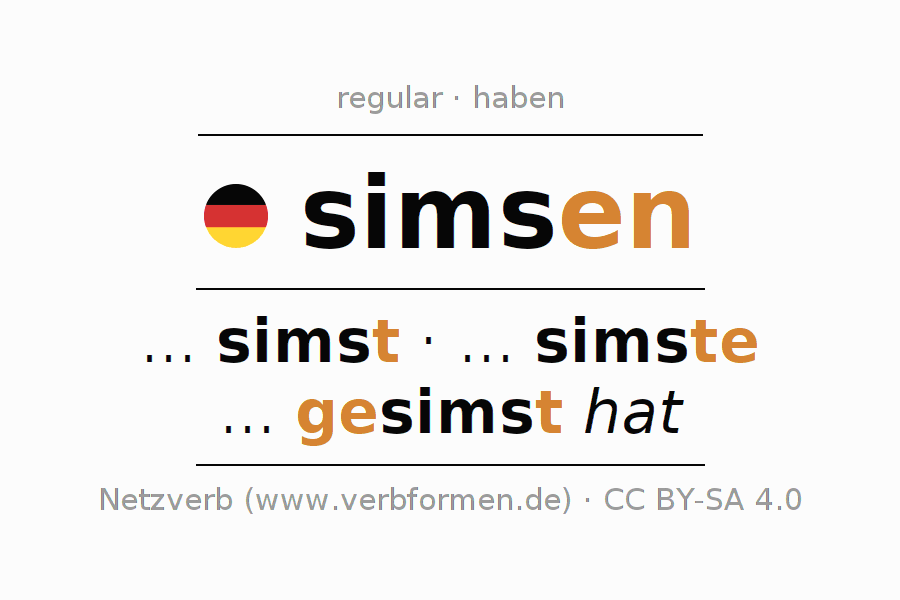 Tablas de verbos para la conjugación de simsen en línea, representadas de forma simple, con todas las construcciones verbales en singular y plural, en todas las personas gramaticales (1ª persona, 2ª persona, 3ª persona). El practicar la conjugación del verbo simsen es útil para tareas, exámenes, la escuela, la universidad, las clases de alemán y para los estudiantes adultos. Especialmente para los estudiantes del alemán es muy importante el conjugar los verbos y el formar las raíces verbales de forma correcta. Aquí encuentras más información acerca del tema Wiktionary simsen und unter simsen im Duden.