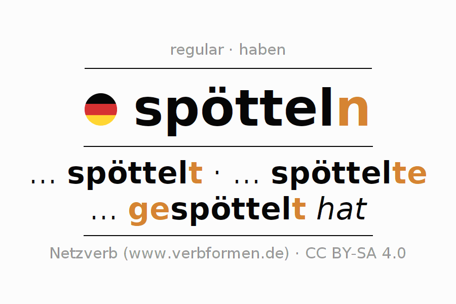 Tablas de verbos para la conjugación de spötteln en línea, representadas de forma simple, con todas las construcciones verbales en singular y plural, en todas las personas gramaticales (1ª persona, 2ª persona, 3ª persona). El practicar la conjugación del verbo spötteln es útil para tareas, exámenes, la escuela, la universidad, las clases de alemán y para los estudiantes adultos. Especialmente para los estudiantes del alemán es muy importante el conjugar los verbos y el formar las raíces verbales de forma correcta. Aquí encuentras más información acerca del tema Wiktionary spötteln und unter spötteln im Duden.