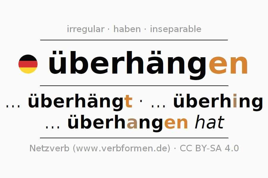 - Pasado perfecto: ... ich überhangen habe, ... du überhangen hast, ... er überhangen hat, ... wir überhangen haben, ... ihr überhangen habt, ... sie überhangen haben
