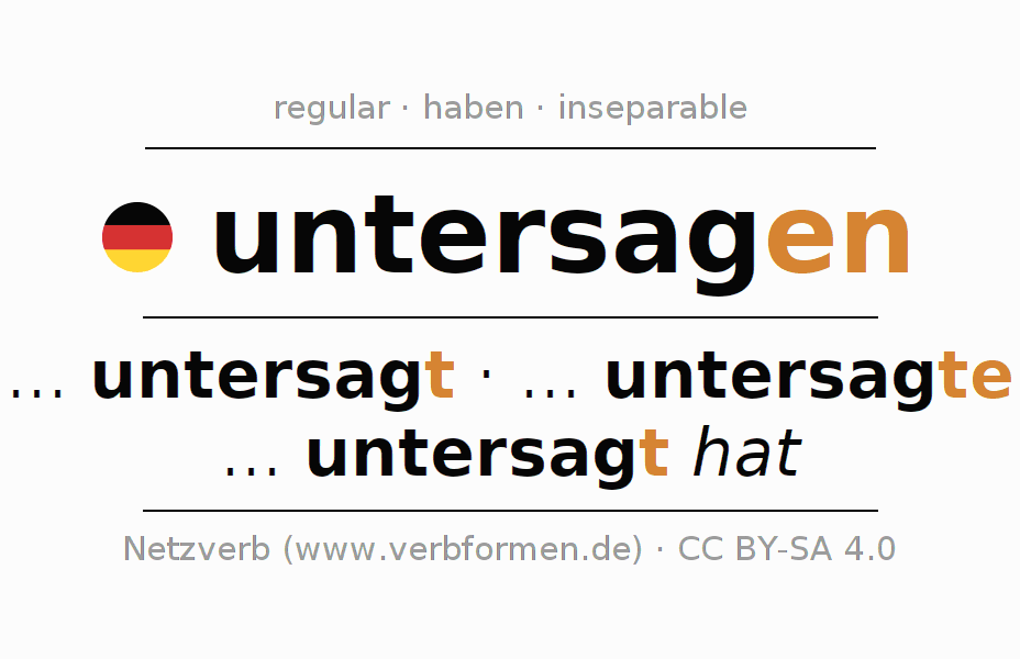- Presente: ... ich untersage, ... du untersagest, ... er untersage, ... wir untersagen, ... ihr untersaget, ... sie untersagen