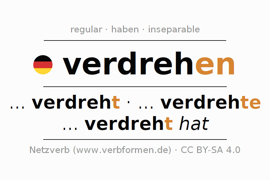 Tablas de verbos para la conjugación de verdrehen en línea, representadas de forma simple, con todas las construcciones verbales en singular y plural, en todas las personas gramaticales (1ª persona, 2ª persona, 3ª persona). El practicar la conjugación del verbo verdrehen es útil para tareas, exámenes, la escuela, la universidad, las clases de alemán y para los estudiantes adultos. Especialmente para los estudiantes del alemán es muy importante el conjugar los verbos y el formar las raíces verbales de forma correcta. Aquí encuentras más información acerca del tema Wiktionary verdrehen und unter verdrehen im Duden.