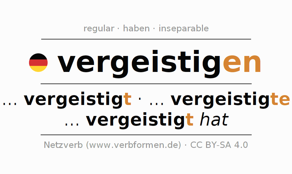 Tablas de verbos para la conjugación de vergeistigen en línea, representadas de forma simple, con todas las construcciones verbales en singular y plural, en todas las personas gramaticales (1ª persona, 2ª persona, 3ª persona). El practicar la conjugación del verbo vergeistigen es útil para tareas, exámenes, la escuela, la universidad, las clases de alemán y para los estudiantes adultos. Especialmente para los estudiantes del alemán es muy importante el conjugar los verbos y el formar las raíces verbales de forma correcta. Aquí encuentras más información acerca del tema Wiktionary vergeistigen und unter vergeistigen im Duden.