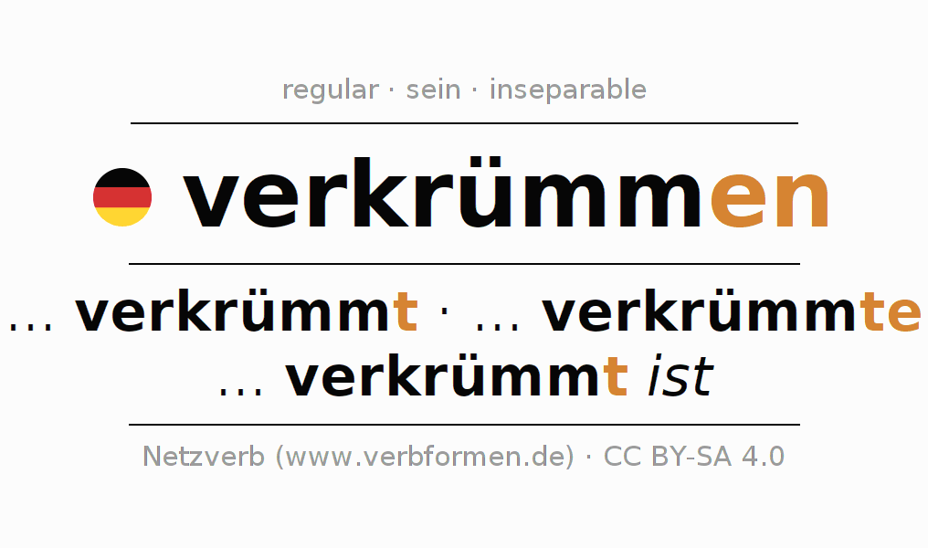 - Presente: verkrümm(e) (du), verkrümmen wir, verkrümmt (ihr), verkrümmen Sie