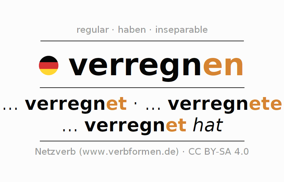 Tablas de verbos para la conjugación de verregnen en línea, representadas de forma simple, con todas las construcciones verbales en singular y plural, en todas las personas gramaticales (1ª persona, 2ª persona, 3ª persona). El practicar la conjugación del verbo verregnen es útil para tareas, exámenes, la escuela, la universidad, las clases de alemán y para los estudiantes adultos. Especialmente para los estudiantes del alemán es muy importante el conjugar los verbos y el formar las raíces verbales de forma correcta. Aquí encuentras más información acerca del tema Wiktionary verregnen und unter verregnen im Duden.