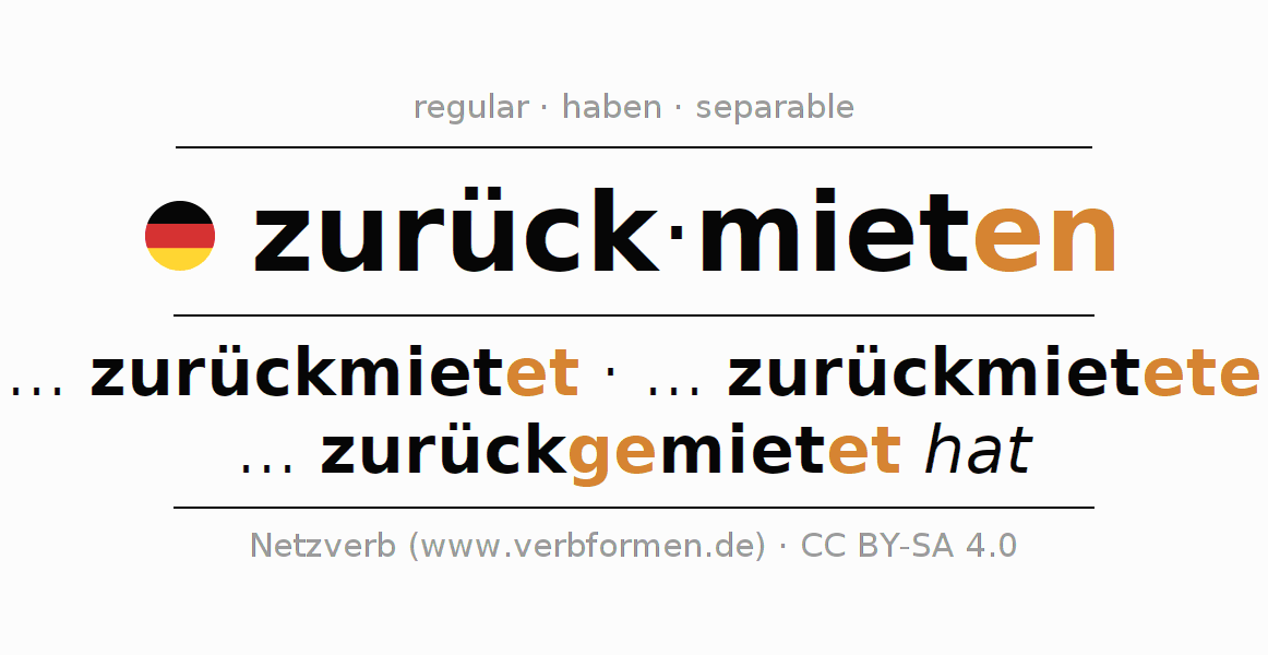 - Futuro I: ... ich zurückmieten werde, ... du zurückmieten wirst, ... er zurückmieten wird, ... wir zurückmieten werden, ... ihr zurückmieten werdet, ... sie zurückmieten werden