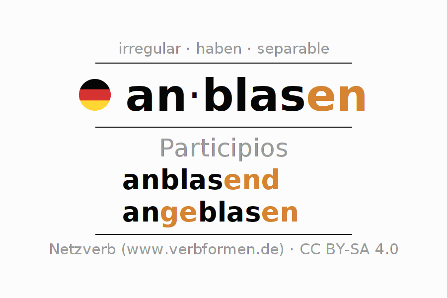 El verbo anblasen, conjugado completamente en todas las personas y números gramaticales en Participio Presente Pasado perfecto.
