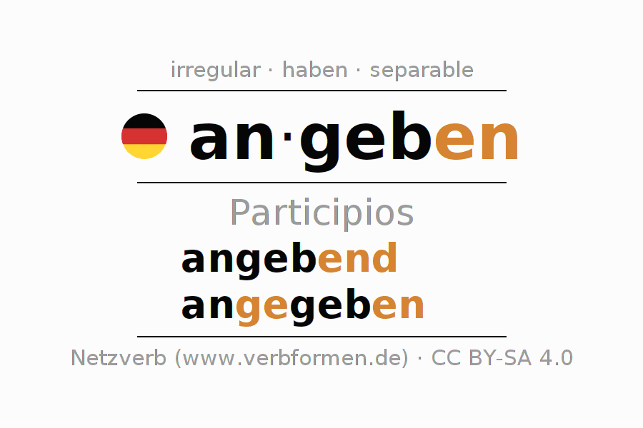 El verbo angeben, conjugado completamente en todas las personas y números gramaticales en Participio Presente Pasado perfecto.