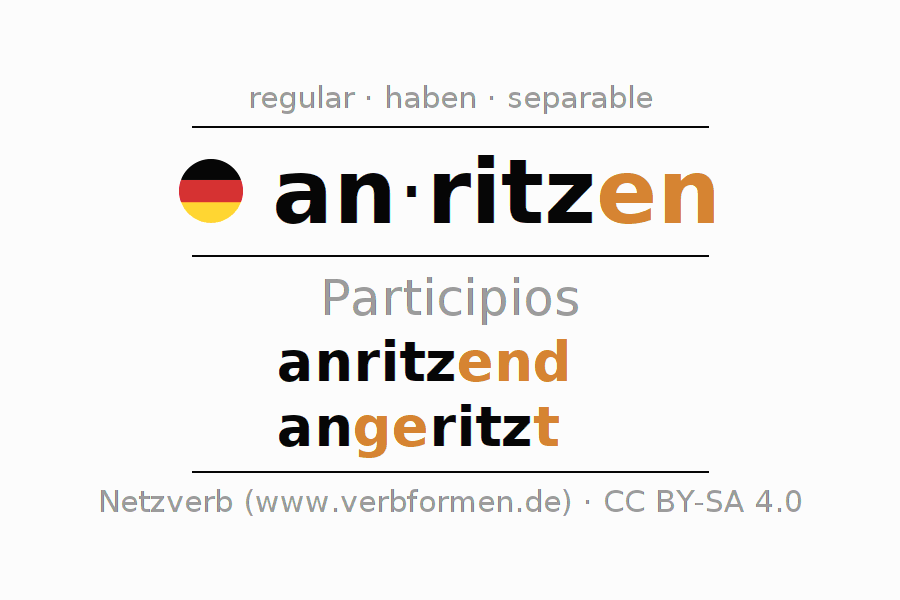 El verbo anritzen, conjugado completamente en todas las personas y números gramaticales en Participio Presente Pasado perfecto.