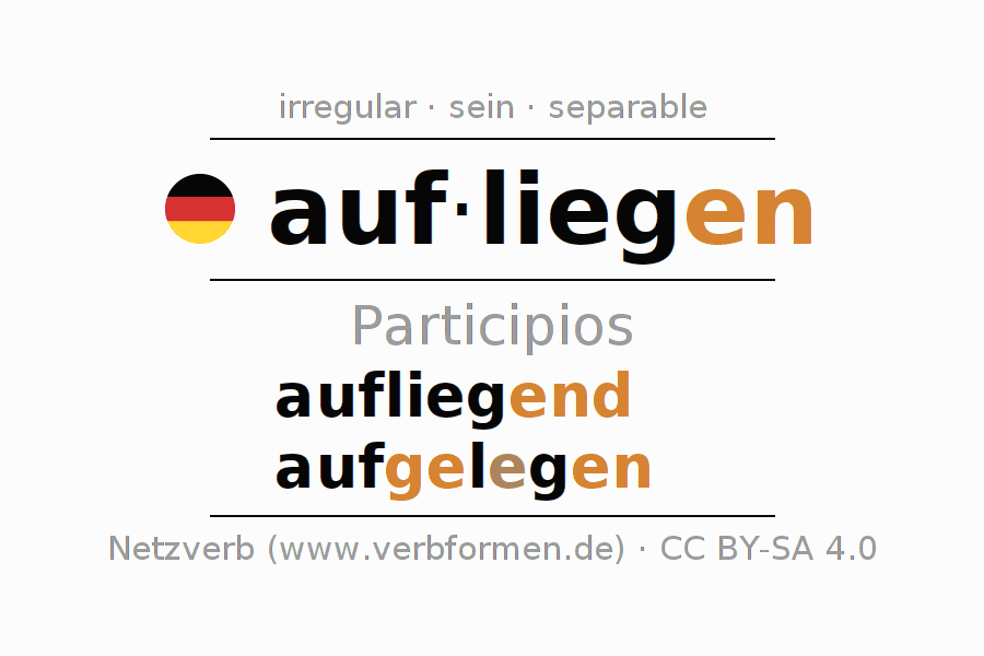 El verbo aufliegen (ist), conjugado completamente en todas las personas y números gramaticales en Participio Presente Pasado perfecto.