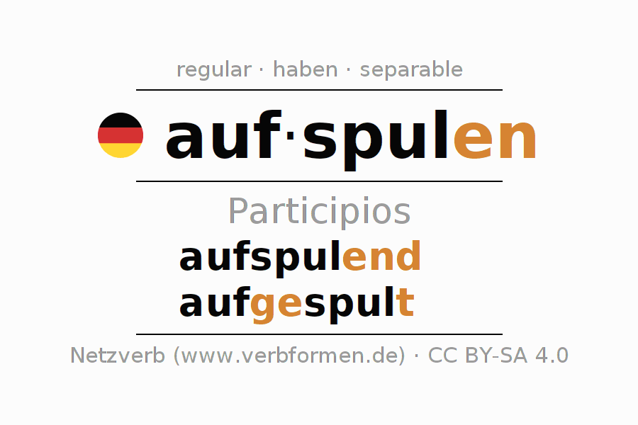 El verbo aufspulen, conjugado completamente en todas las personas y números gramaticales en Participio Presente Pasado perfecto.