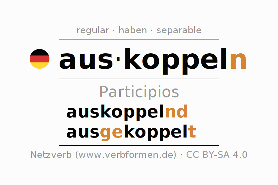 El verbo auskoppeln, conjugado completamente en todas las personas y números gramaticales en Participio Presente Pasado perfecto.