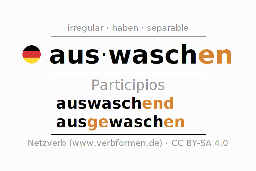 El verbo auswaschen, conjugado completamente en todas las personas y números gramaticales en Participio Presente Pasado perfecto.