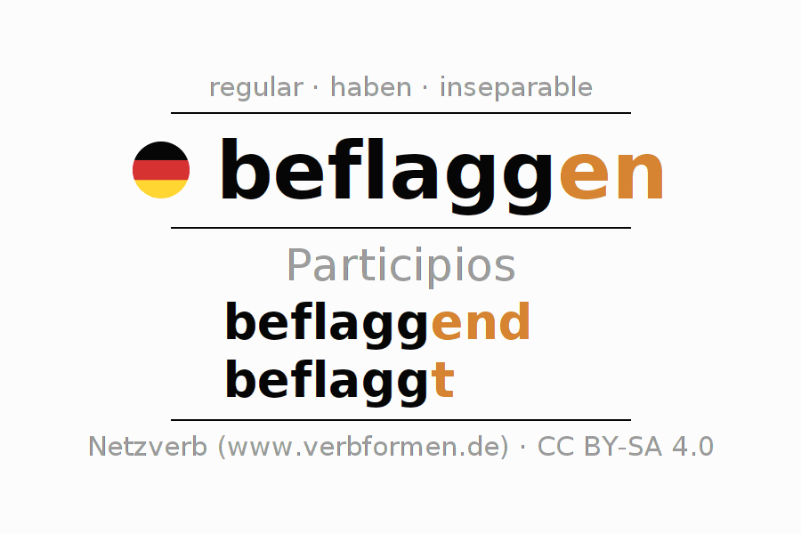 El verbo beflaggen, conjugado completamente en todas las personas y números gramaticales en Participio Presente Pasado perfecto.