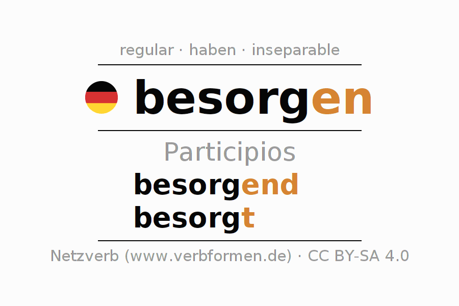El verbo besorgen, conjugado completamente en todas las personas y números gramaticales en Participio Presente Pasado perfecto.