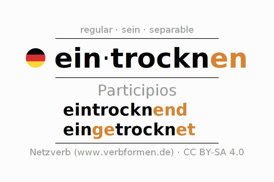 El verbo eintrocknen, conjugado completamente en todas las personas y números gramaticales en Participio Presente Pasado perfecto.