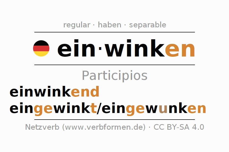 El verbo einwinken, conjugado completamente en todas las personas y números gramaticales en Participio Presente Pasado perfecto.