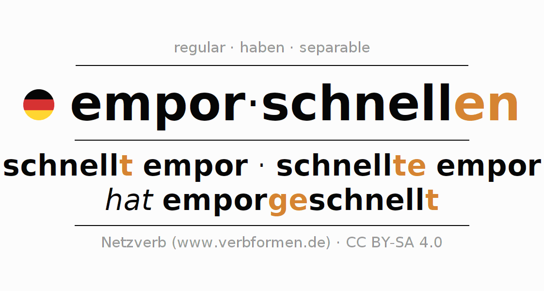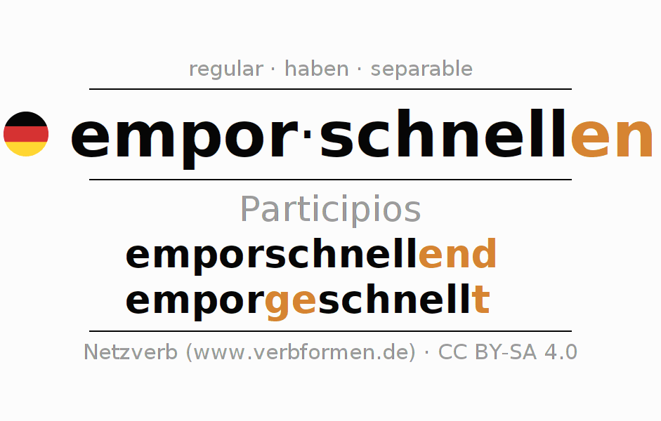 El verbo emporschnellen (hat), conjugado completamente en todas las personas y números gramaticales en Participio Presente Pasado perfecto.