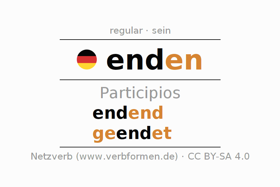 El verbo enden (ist), conjugado completamente en todas las personas y números gramaticales en Participio Presente Pasado perfecto.