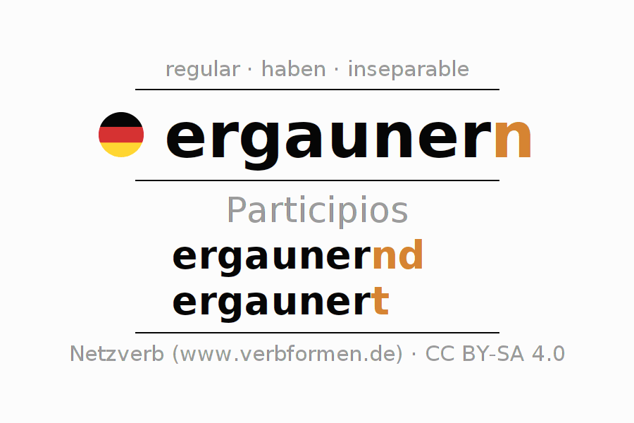 El verbo ergaunern, conjugado completamente en todas las personas y números gramaticales en Participio Presente Pasado perfecto.