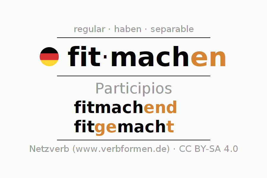 El verbo fitmachen, conjugado completamente en todas las personas y números gramaticales en Participio Presente Pasado perfecto.