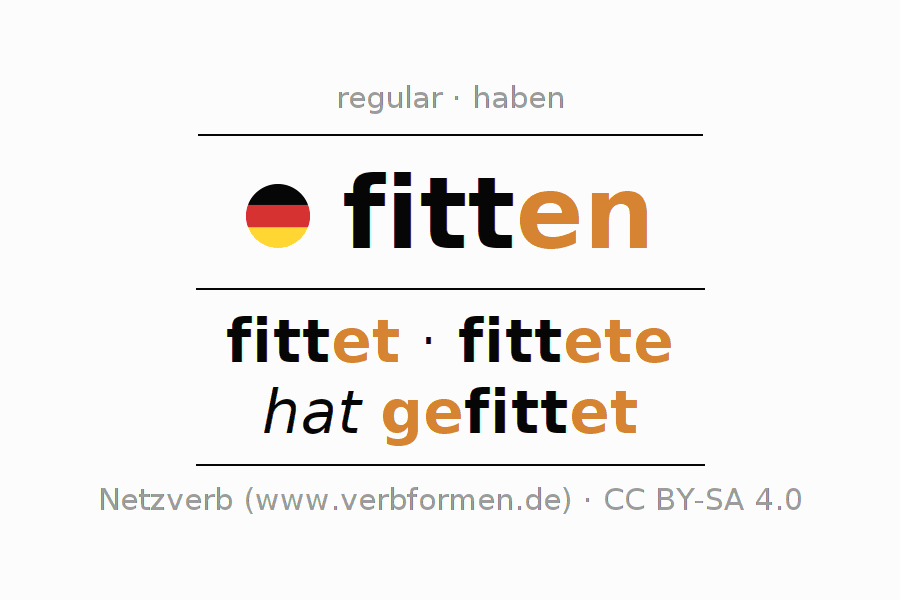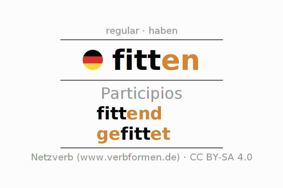 El verbo fitten, conjugado completamente en todas las personas y números gramaticales en Participio Presente Pasado perfecto.