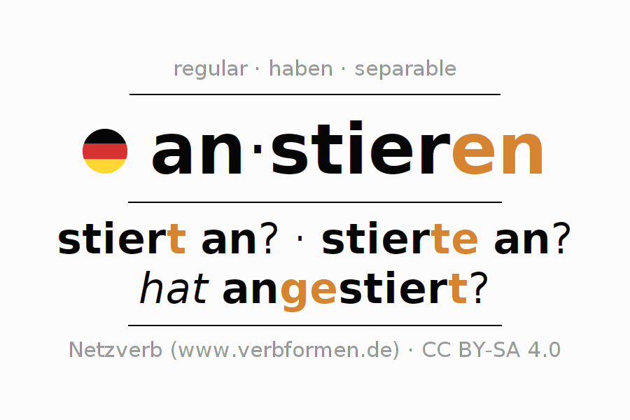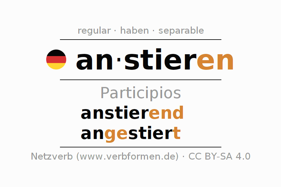 El verbo anstieren, conjugado completamente en todas las personas y números gramaticales en Participio Presente Pasado perfecto.