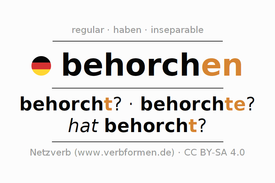 El verbo behorchen, conjugado completamente en todas las personas y números gramaticales en Participio Presente Pasado perfecto.