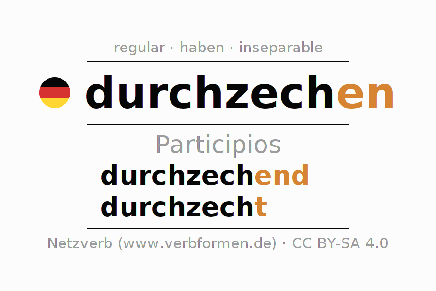 El verbo durchzechen, conjugado completamente en todas las personas y números gramaticales en Participio Presente Pasado perfecto.