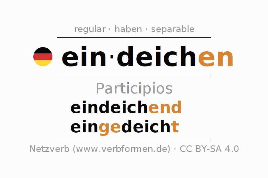 El verbo eindeichen, conjugado completamente en todas las personas y números gramaticales en Participio Presente Pasado perfecto.
