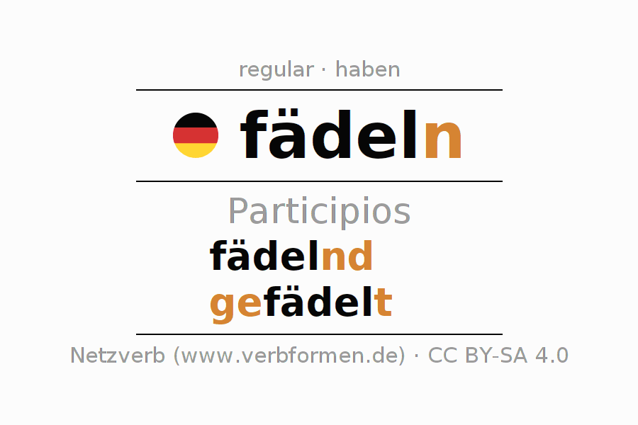 El verbo fädeln, conjugado completamente en todas las personas y números gramaticales en Participio Presente Pasado perfecto.