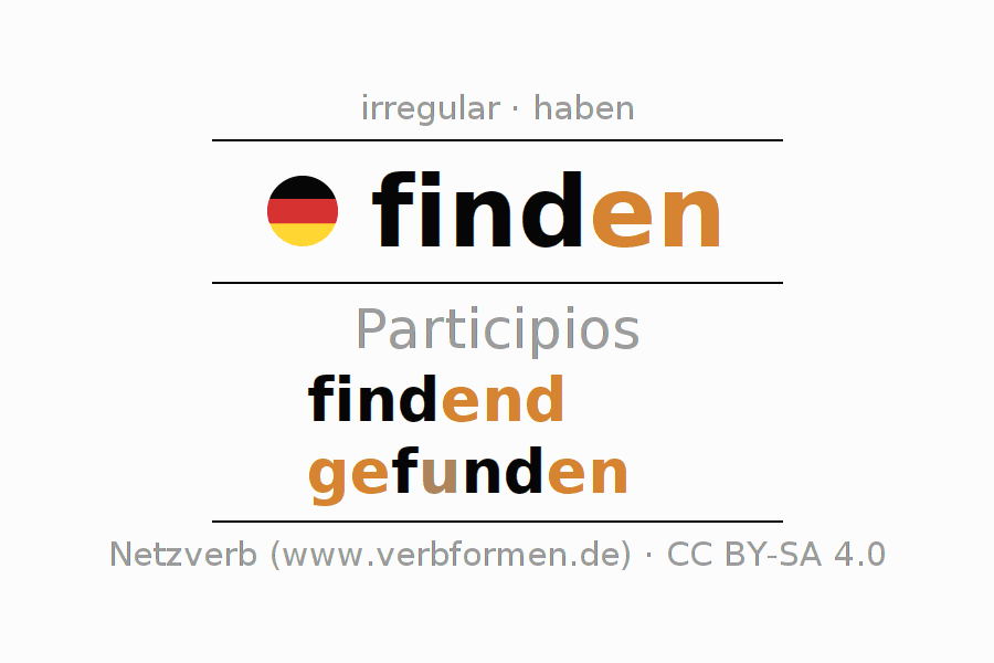 El verbo finden, conjugado completamente en todas las personas y números gramaticales en Participio Presente Pasado perfecto.