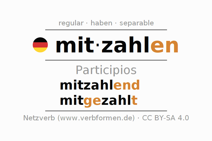 El verbo mitzahlen, conjugado completamente en todas las personas y números gramaticales en Participio Presente Pasado perfecto.