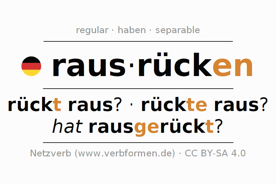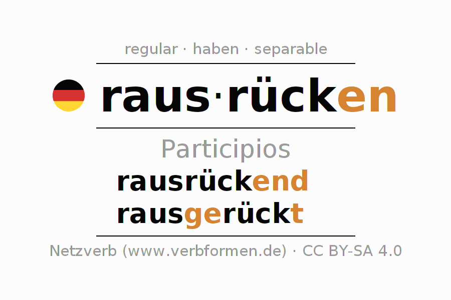 El verbo rausrücken (hat), conjugado completamente en todas las personas y números gramaticales en Participio Presente Pasado perfecto.