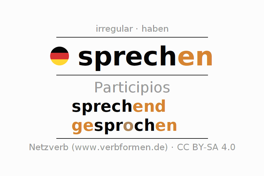La conjugación de sprechen en Participio Presente Pasado perfecto palabra del habla Activo es sprechend, gesprochen.Para construir esta formas se requiere seguir algunas reglas gramaticales y también las especificaciones para la conjugación de verbos simples de sprechen en Participio . Comentarios ☆