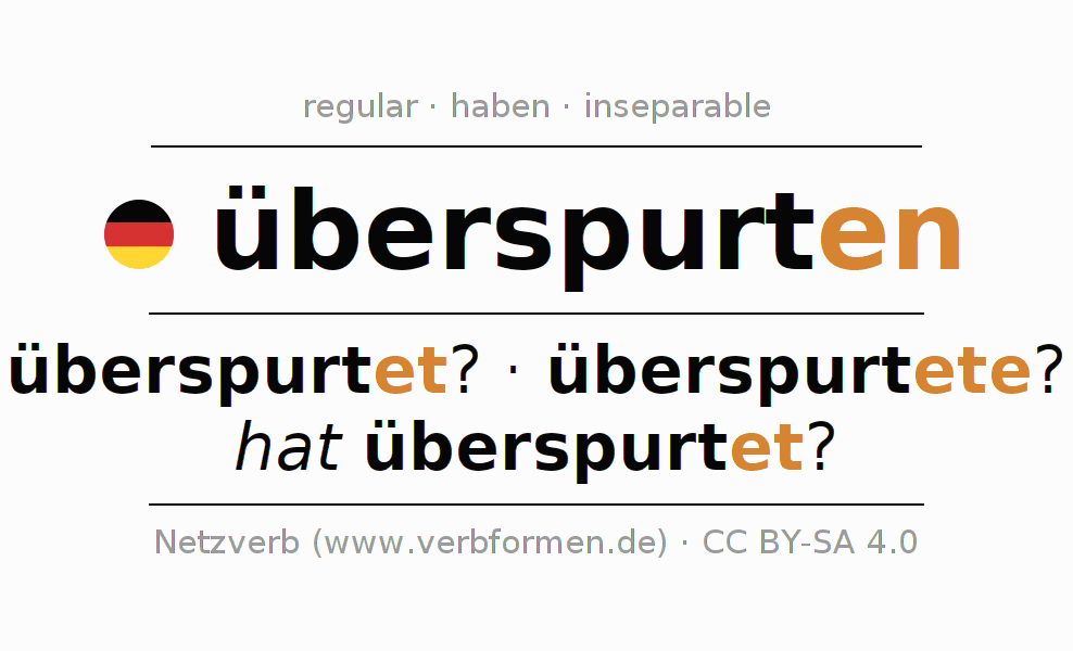 El verbo überspurten, conjugado completamente en todas las personas y números gramaticales en Participio Presente Pasado perfecto.