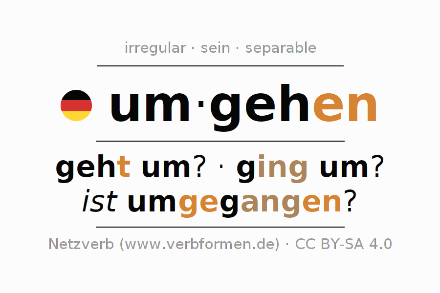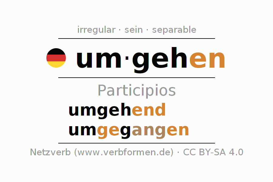 La conjugación de umgehen en Participio Presente Pasado perfecto palabra del habla Activo es umgehend, umgegangen.Para construir esta formas se requiere seguir algunas reglas gramaticales y también las especificaciones para la conjugación de verbos simples de umgehen en Participio . Comentarios ☆