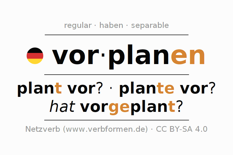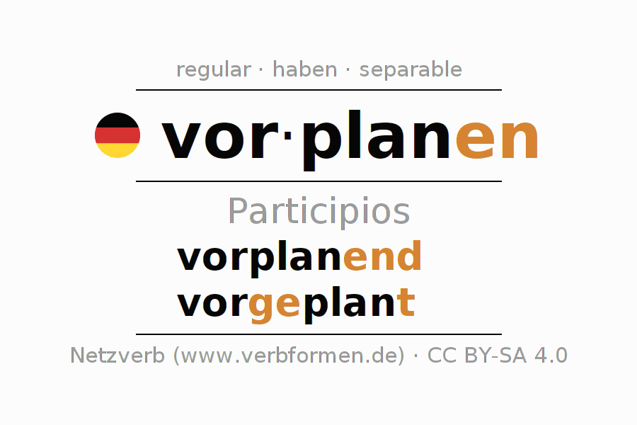 El verbo vorplanen, conjugado completamente en todas las personas y números gramaticales en Participio Presente Pasado perfecto.
