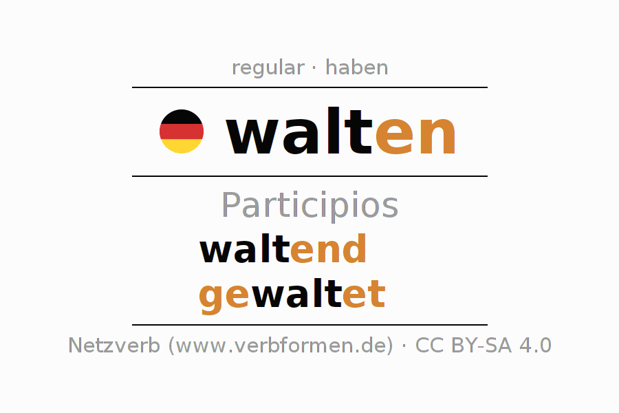 El verbo walten, conjugado completamente en todas las personas y números gramaticales en Participio Presente Pasado perfecto.