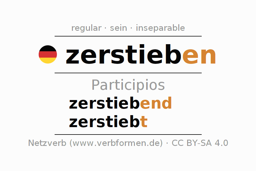 El verbo zerstieben (regelm), conjugado completamente en todas las personas y números gramaticales en Participio Presente Pasado perfecto.