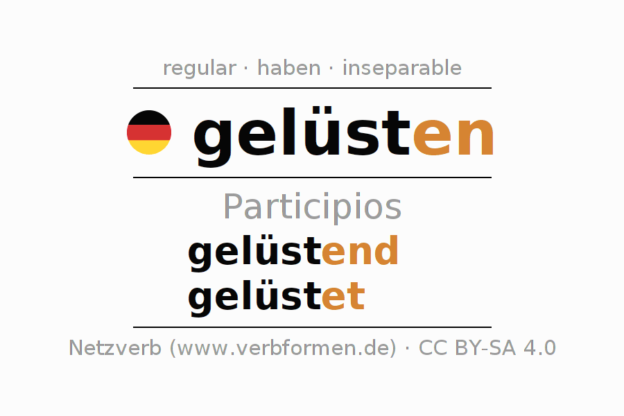 El verbo gelüsten, conjugado completamente en todas las personas y números gramaticales en Participio Presente Pasado perfecto.