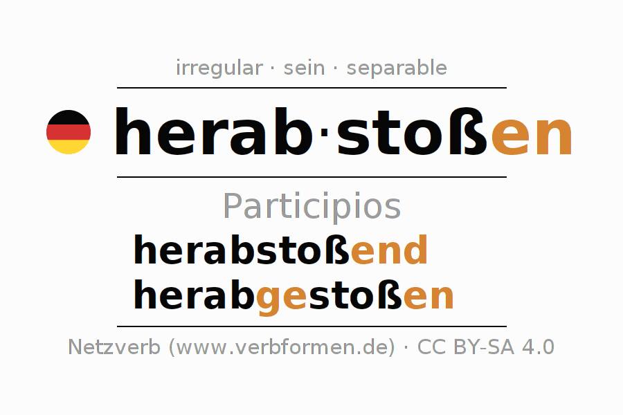 El verbo herabstoßen, conjugado completamente en todas las personas y números gramaticales en Participio Presente Pasado perfecto.