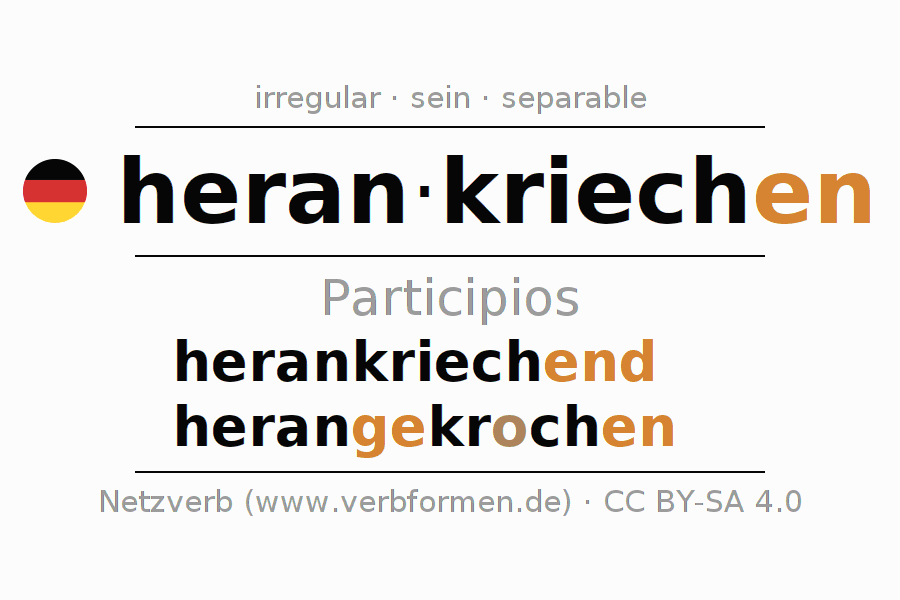 El verbo herankriechen, conjugado completamente en todas las personas y números gramaticales en Participio Presente Pasado perfecto.