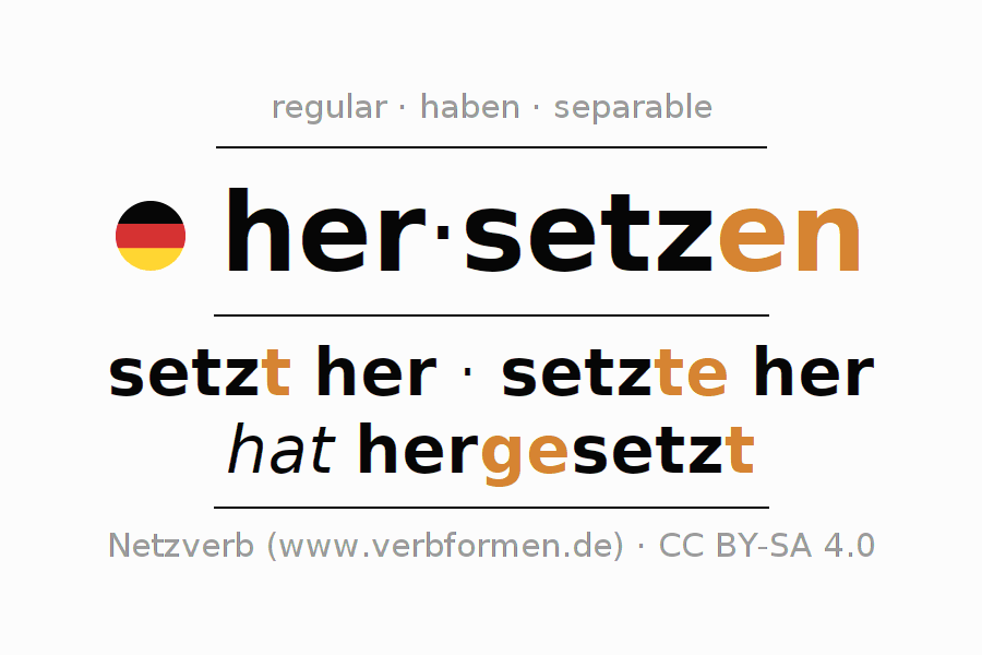 El verbo hersetzen, conjugado completamente en todas las personas y números gramaticales en Participio Presente Pasado perfecto.