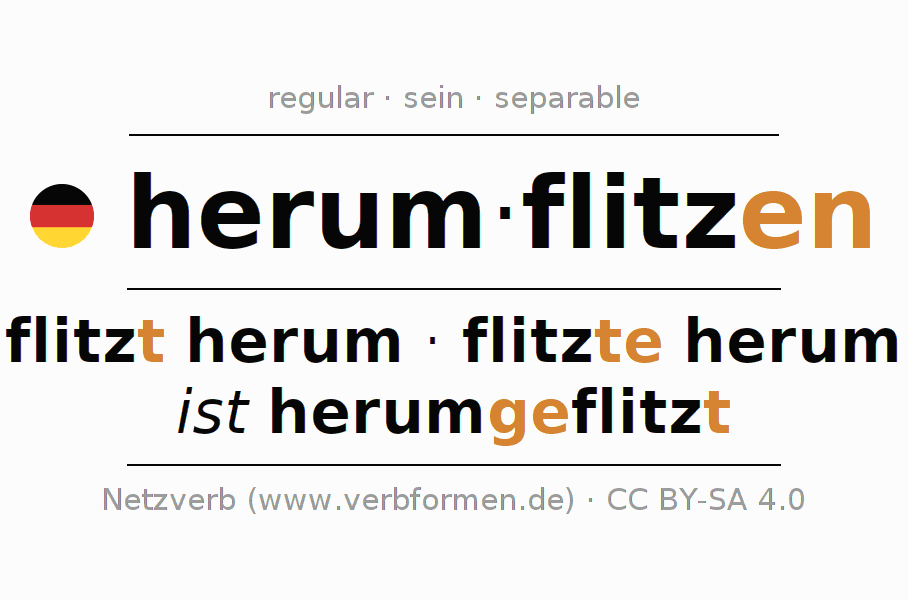 El verbo herumflitzen, conjugado completamente en todas las personas y números gramaticales en Participio Presente Pasado perfecto.