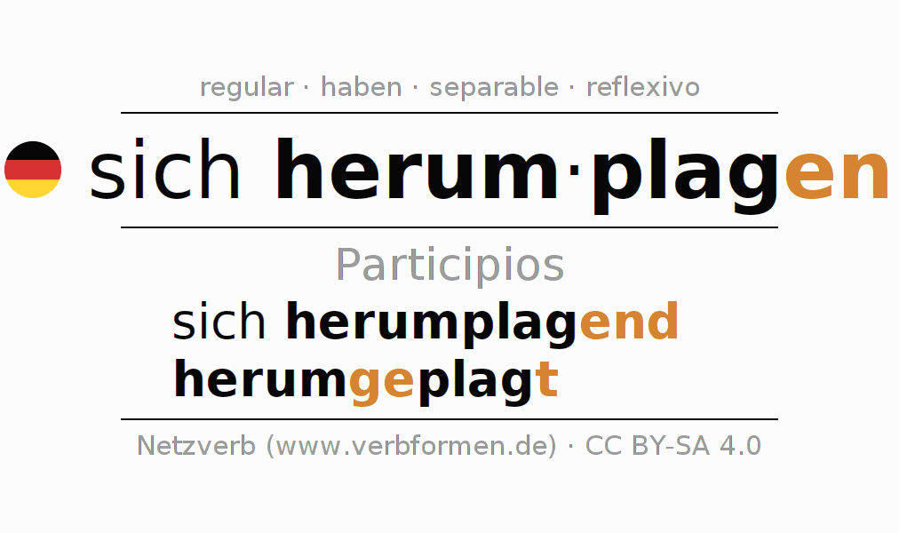 El verbo sich herumplagen, conjugado completamente en todas las personas y números gramaticales en Participio Presente Pasado perfecto.