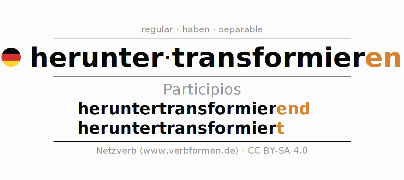 El verbo heruntertransformieren, conjugado completamente en todas las personas y números gramaticales en Participio Presente Pasado perfecto.