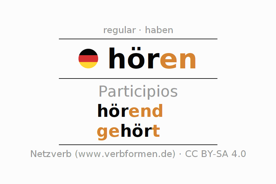 El verbo hören, conjugado completamente en todas las personas y números gramaticales en Participio Presente Pasado perfecto.